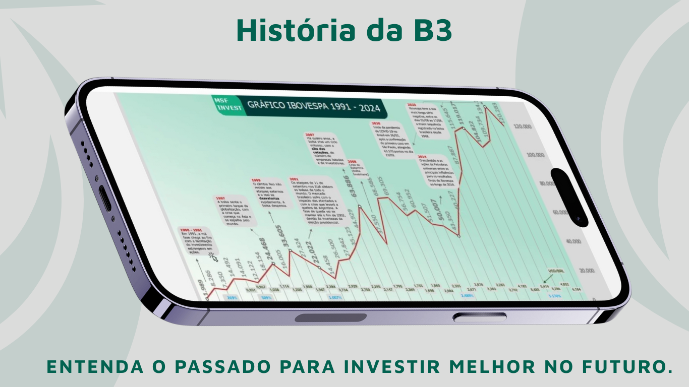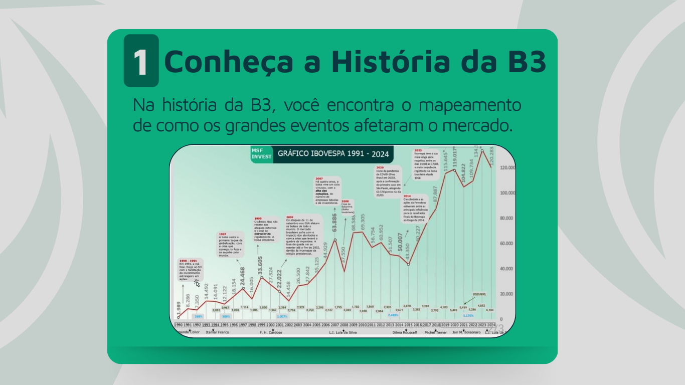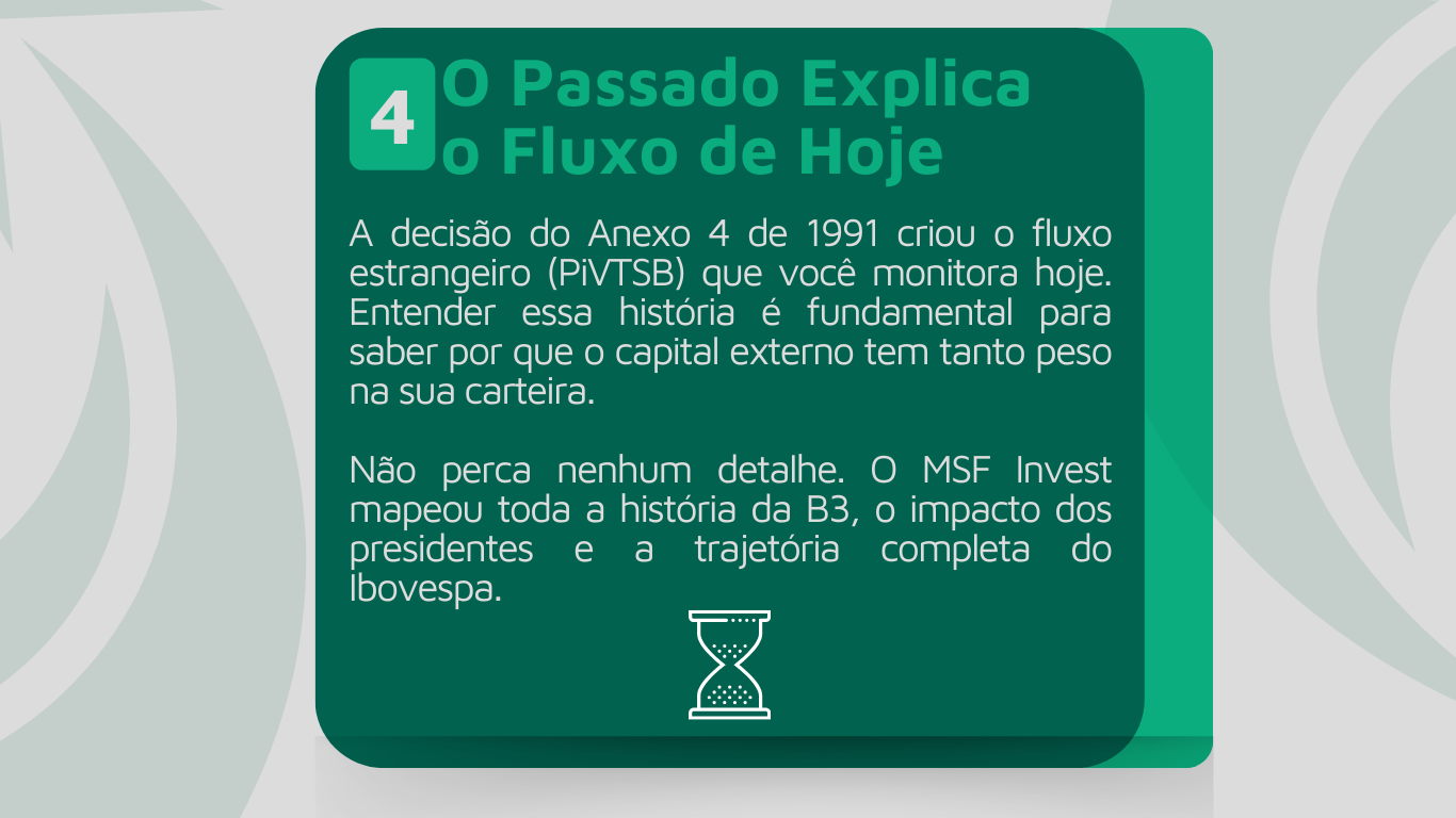 O módulo História da B3 do aplicativo MSF Invest foi criado para que você compreenda como as grandes decisões estruturais do passado explicam o comportamento do investidor estrangeiro, a liquidez atual e os grandes ciclos do Ibovespa.